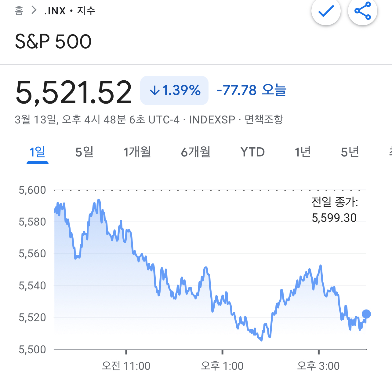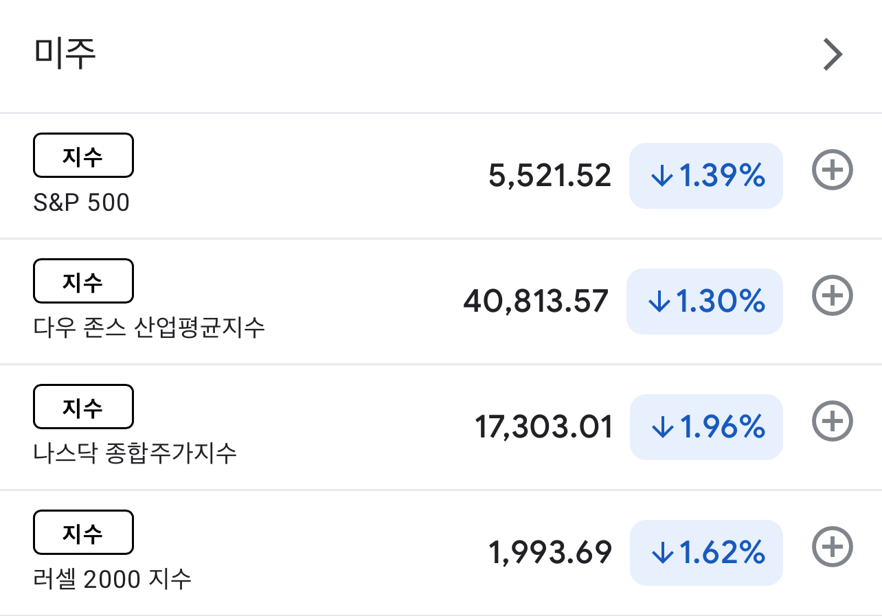 • S&P 500: 전일 대비 1.4% 하락하여 5,521.52로 마감했습니다. 이는 최근 최고치 대비 10.1% 하락한 수치로, 2023년 이후 첫 번째 ‘조정’ 국면에 진입했습니다.