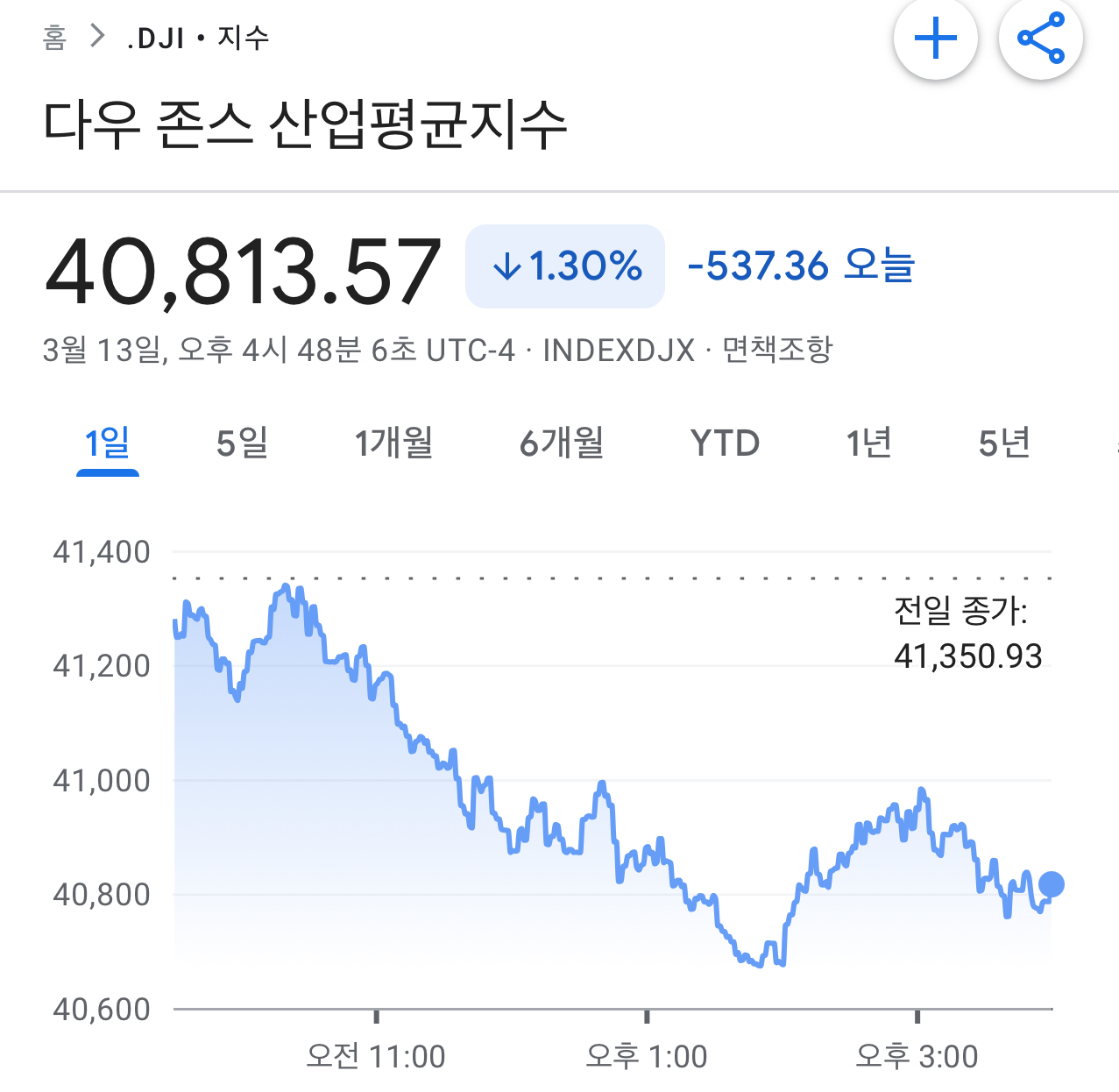 • 다우존스 산업평균지수: 537.36포인트(1.3%) 하락하여 40,813.57로 마감했습니다.